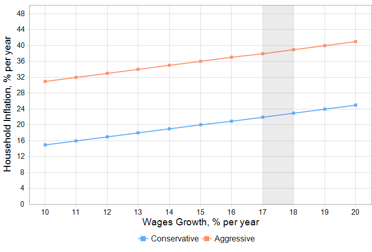 Ниже представлен график бытовой инфляции в зависимости от темпов роста заработной платы для трёх сценариев: консервативного, среднего и агрессивного для следующих исходных данных (млрд долларов США):