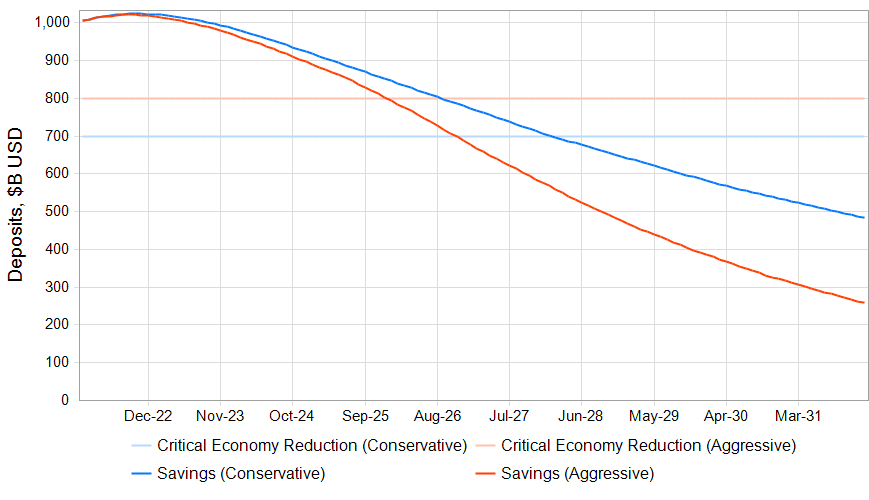 К 2025-му году, после исчерпания валютных резервов, единственным источником компенсации дополнительных расходов стали корпоративные и персональные накопления, темпы снижения которых вычисляются как (7% / 55%) × 100% ≈ 13% в год. И это консервативный сценарий — без учёта вероятного снижения доходов от экспорта нефти, что в случае падения цены на нефть марки Brent до 55 долларов за баррель может ускорить процесс примерно вдвое. Очевидно, что по мере снижения накоплений, темпы их падения будут сокращаться вследствие снижения объема потребления.